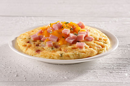 Whole Eggs, Pasteurized Process Cheddar Cheese [Cheddar Cheese (Milk, Cheese Culture, Salt, Enzymes), Water, Sodium Phosphate, Milkfat, Sodium Hexametaphosphate, Salt, Paprika and Annatto (color), Powdered Cellulose (to prevent caking)], Water, Pre-cooked Ham-Water added (Ham, Water, Salt, Dextrose, Sodium Phosphates, Smoke Flavoring, Sodium Erythorbate, Sodium Nitrite), Onions, Green Peppers, Red Peppers, Soybean Oil, Whole Milk, Modified Corn Starch, Salt, Xanthan Gum, Citric Acid. CONTAINS: EGG, MILK.